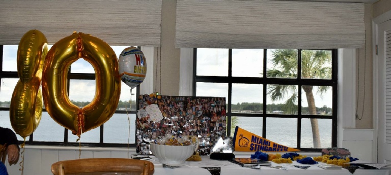 Decorated display table: “8” (admiring window view) and “0”balloons, Happy Birthday balloon, collage (created by Norma Rabinowitz Greenstein, bowl of delicious cookies baked by Margaret Grieshaber, voo-doo dolls, book “Stingaree Century,”photo album, carved wooden Orange Bowl.